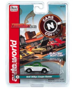 This is the Auto World 1941 Willys Coupe Gasser Green/White Thunderjet HO Slot Car from the Cars-N-Coffee Thunderjet Release 31 series.