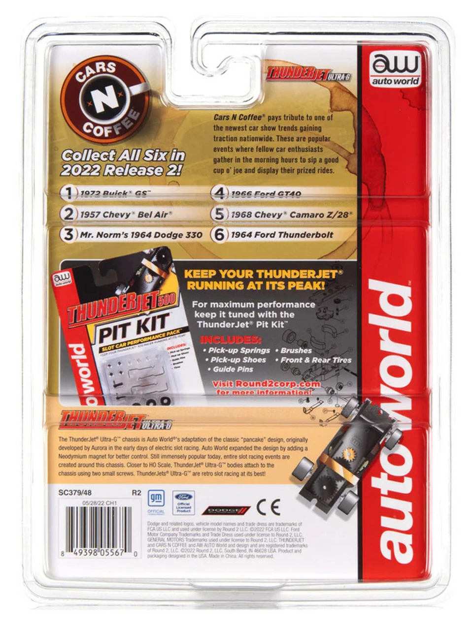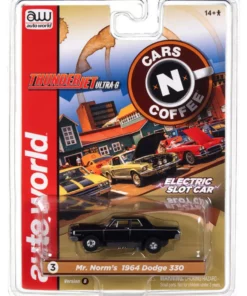 This is the Auto World 1964 Dodge 330 “Mr. Norm’s” (Black) Cars N Coffee Thunderjet HO Slot Car.