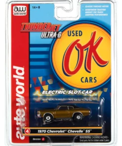 This is the OK USED CARS Auto World 1970 Chevrolet Chevelle SS (Gold) Thunderjet HO Slot Car