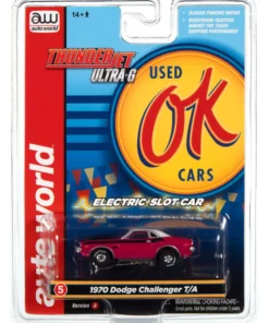 This is the OK USED CARS Auto World 1970 Dodge Challenger T/A Panther (Pink) Thunderjet HO Slot Car