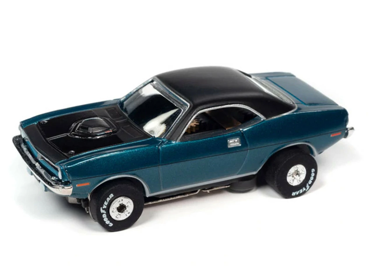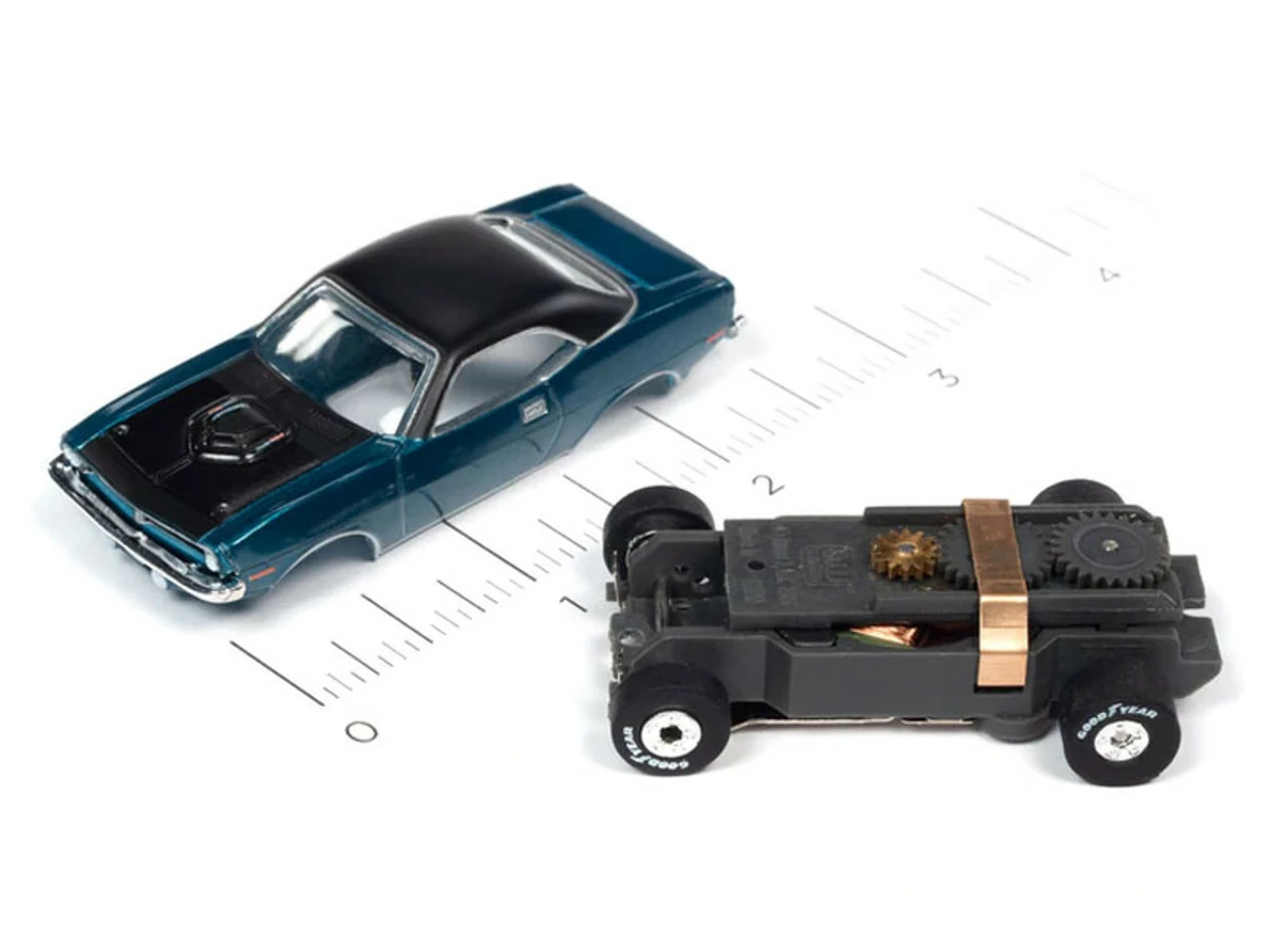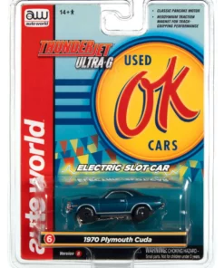 This is the OK USED CARS Auto World 1970 Plymouth Cuda (Teal) Thunderjet HO Slot Car
