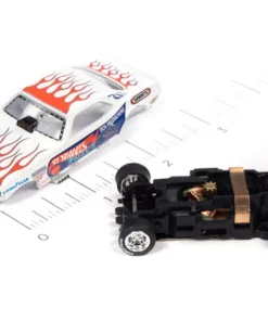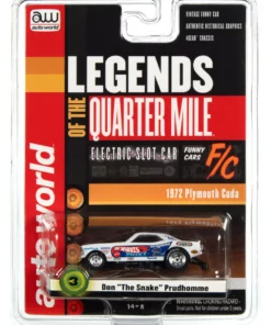 This is the LEGENDS OF THE QUARTER MILE Auto World 1972 Plymouth Cuda Funny Car (White w/Flames) Don ” The Snake” Prudhomme Snake II 4Gear HO Slot Car