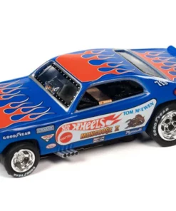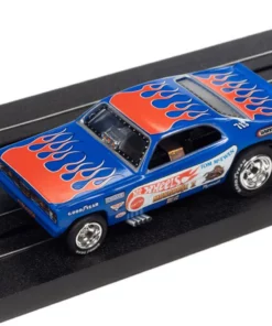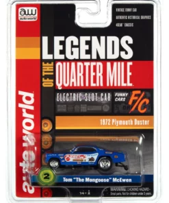 This is the LEGENDS OF THE QUARTER MILE Auto World 1972 Plymouth Duster Funny Car (Blue w/Flames) Tom “The Mongoose” McEwen Mongoose II 4Gear Legends HO Slot Car