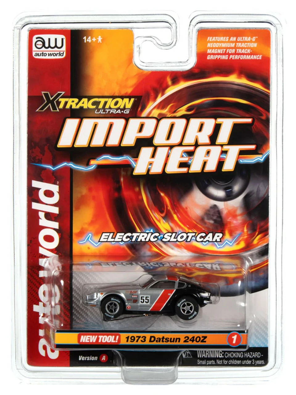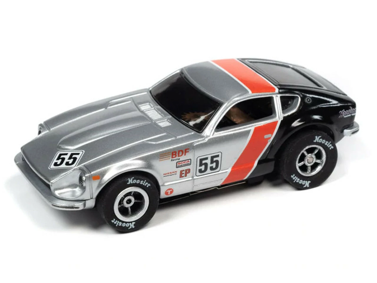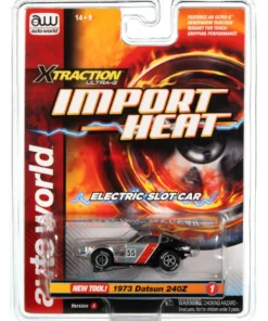 This is the IMPORT HEAT Auto World 1973 Datsun 24OZ (Silver/Red/Black) Import Heat X-Traction HO Slot Car