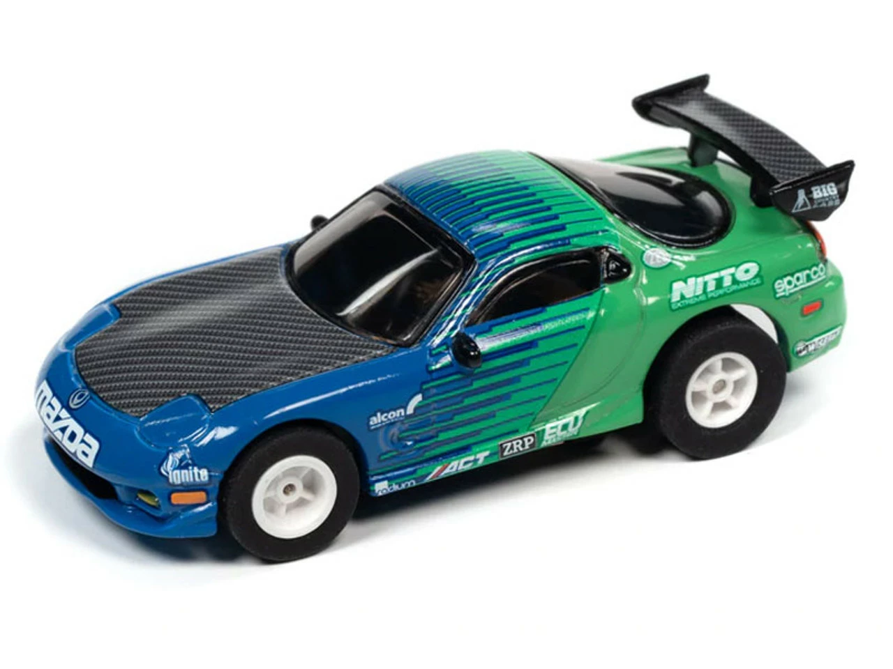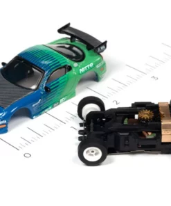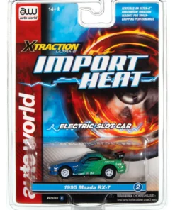 This is the IMPORT HEAT Auto World 1995 Mazda RX-7 (Blue/Green) Import Heat X-Traction HO Slot Car
