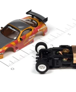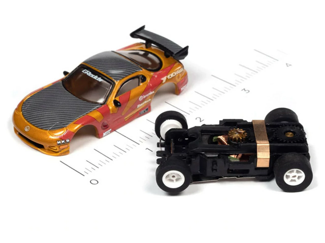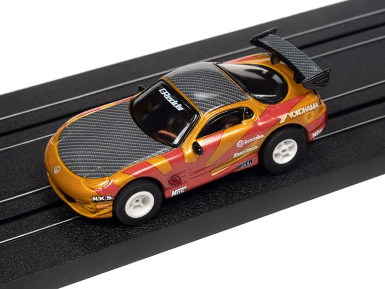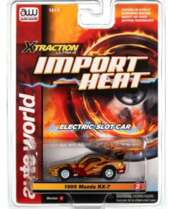 This is the IMPORT HEAT Auto World 1995 Mazda RX-7 (Gold/Red) Import Heat X-Traction HO Slot Car