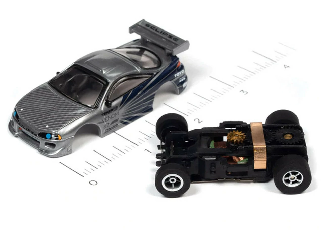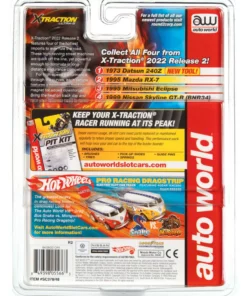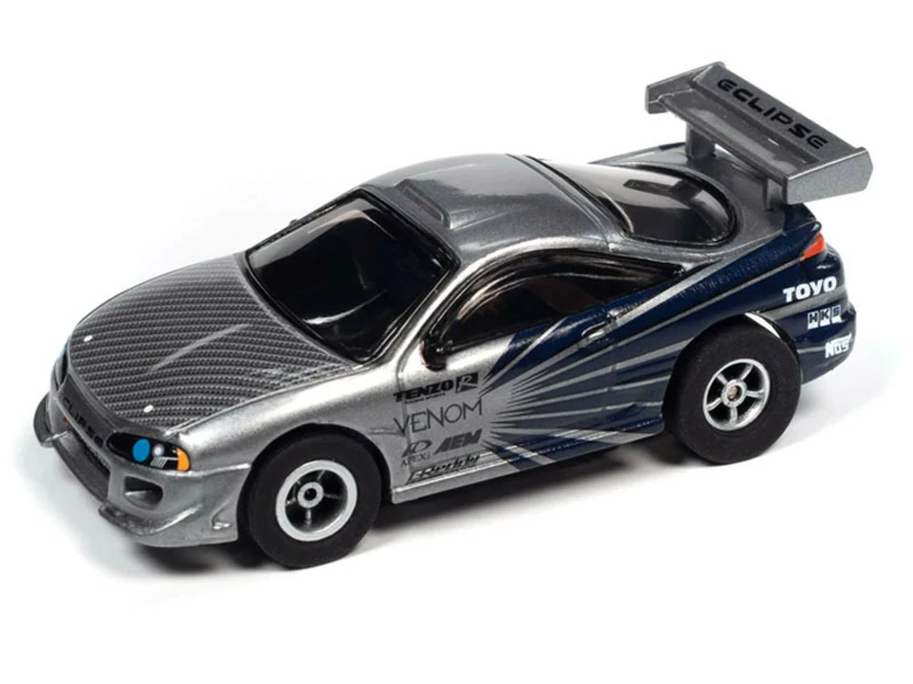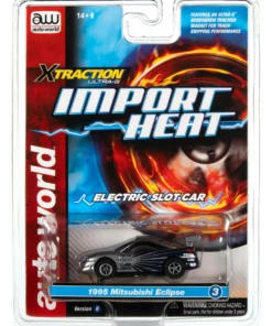 This is the IMPORT HEAT Auto World 1995 Mitsubishi Eclipse (Platinum/Blue) Import Heat X-Traction HO Slot Car