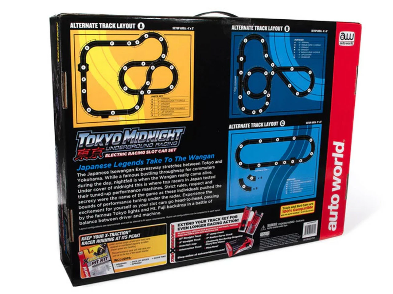 The Japanese Isewangan Expressway stretches between Tokyo and Yokohama. While a famous bustling throughway for commuters during the day, nightfall is when the Wangan really came alive. Under cover of midnight this is where top racers in Japan tested their tuned-up performance machines. Strict rules, respect and secrecy were the name of the game as these individuals pushed the bounds of performance tuning under the radar. Experience the excitement for yourself as your slot cars go head-to-head, passing by the famous Tokyo lights and Mt. Fuji backdrop in a battle of balance between driver and machine