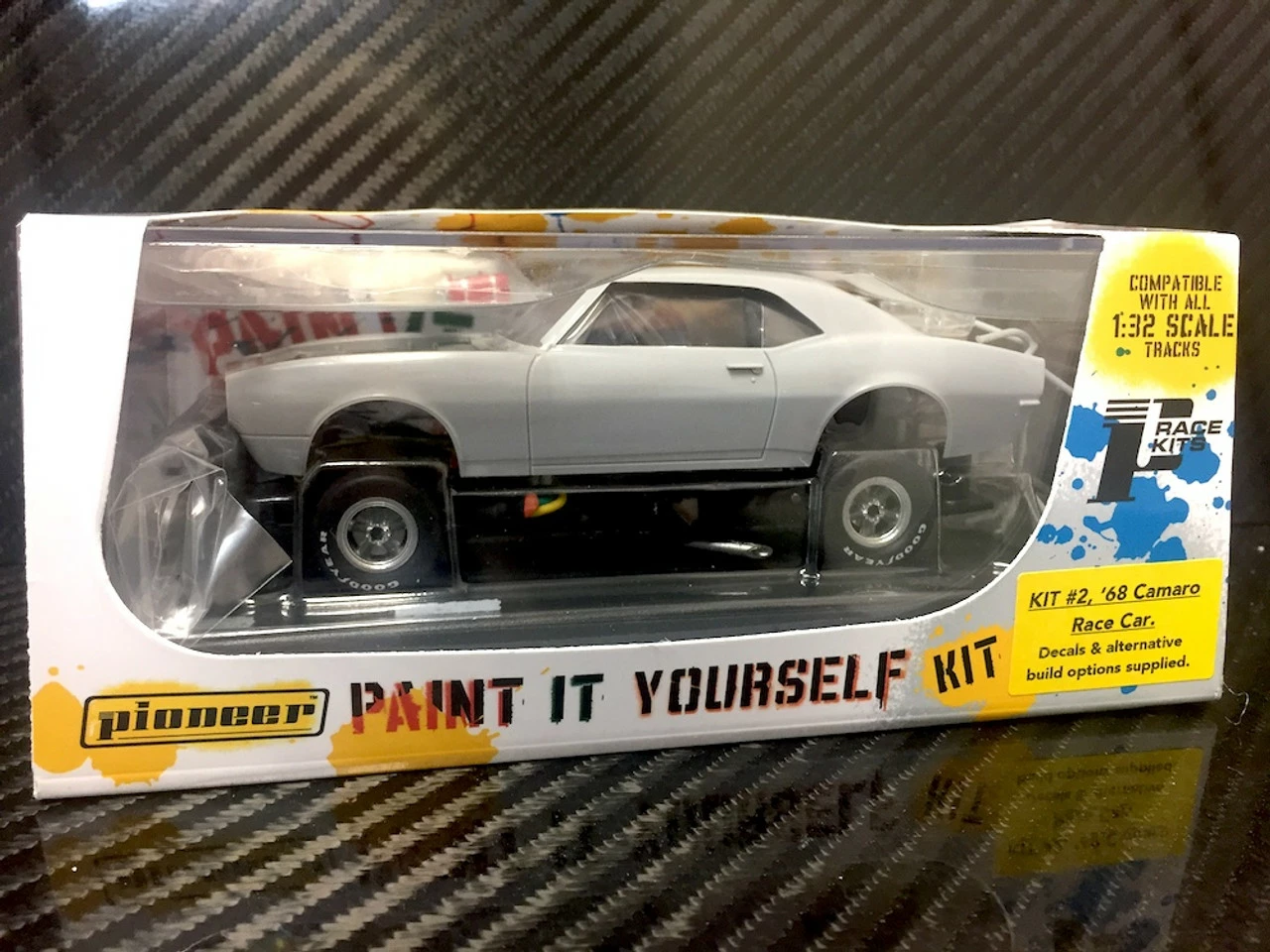 This is the Pioneer 1968 Chevy Camaro Race Car Paint It Yourself PIY Kit 1/32 Slot Car. These kits give modelers of all ages the opportunity to both customize their vehicle and learn about the mechanical workings of the cars.