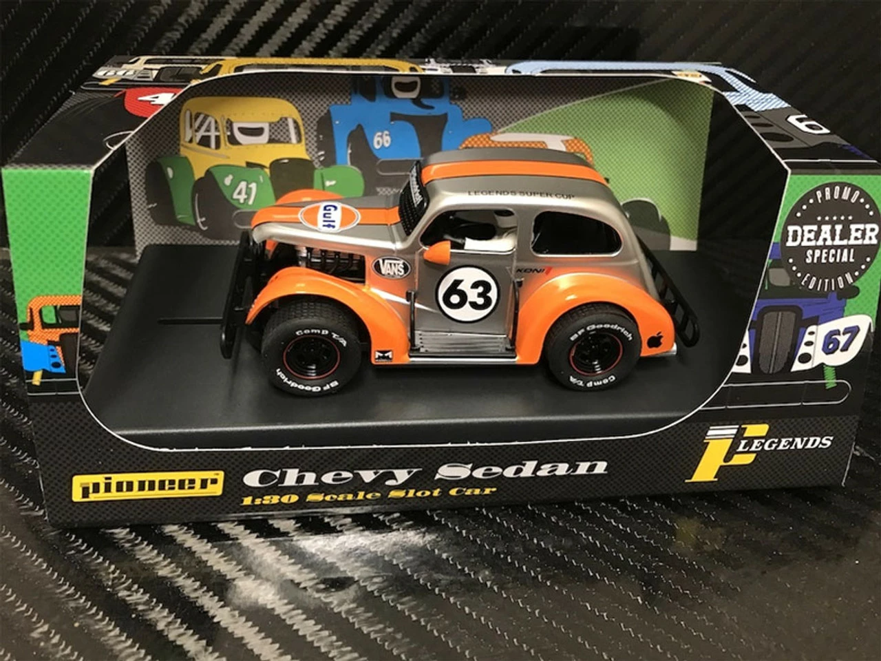 Pioneer โ37 Chevy Sedan Legends Racer #63, DEALER SPECIAL, Gulf, Silver 1/32 Slot Car.