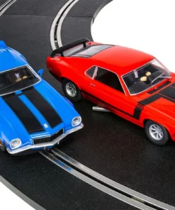 This is the Scalextric American Street Dual 1/32 Slot Car Set. 1970s Chevrolet Camaro vs 1970s Ford Mustang.