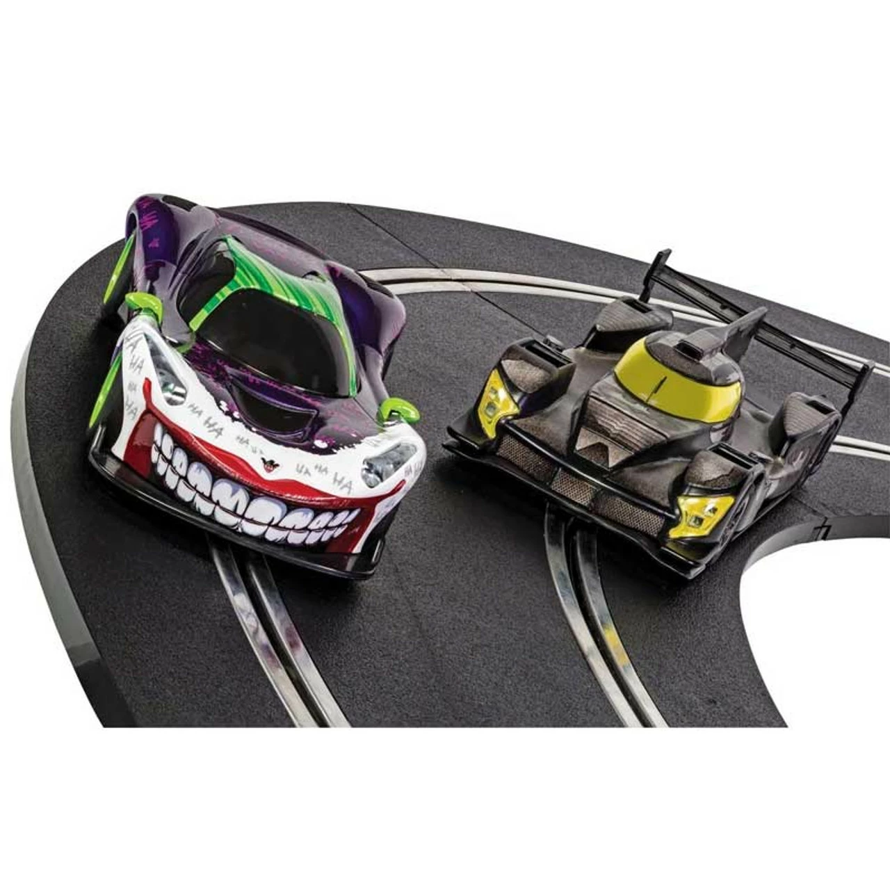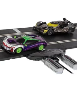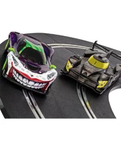 Batman and the Joker have been adversaries since they first met in 1940. Since then, the Clown Prince of Crime has found creative ways to escape the Caped Crusader, and in this Scalextric Batman vs Joker Spark Plug set the themed Joker car, complete with a green roof, purple body and wide grin to mimic his famous look, takes on the black Batman car, dark enough to hide in the shadows and pounce on one of his worst enemies.