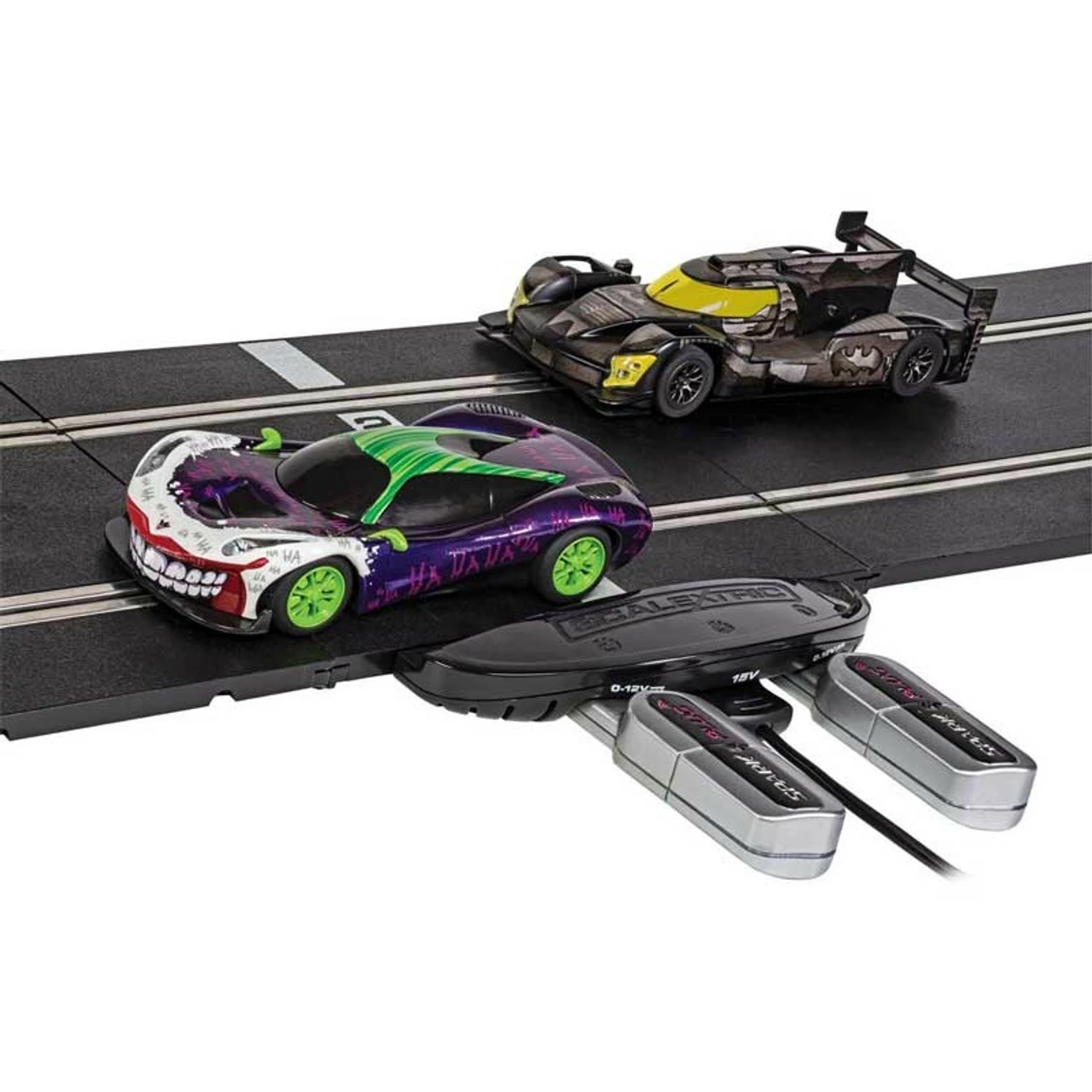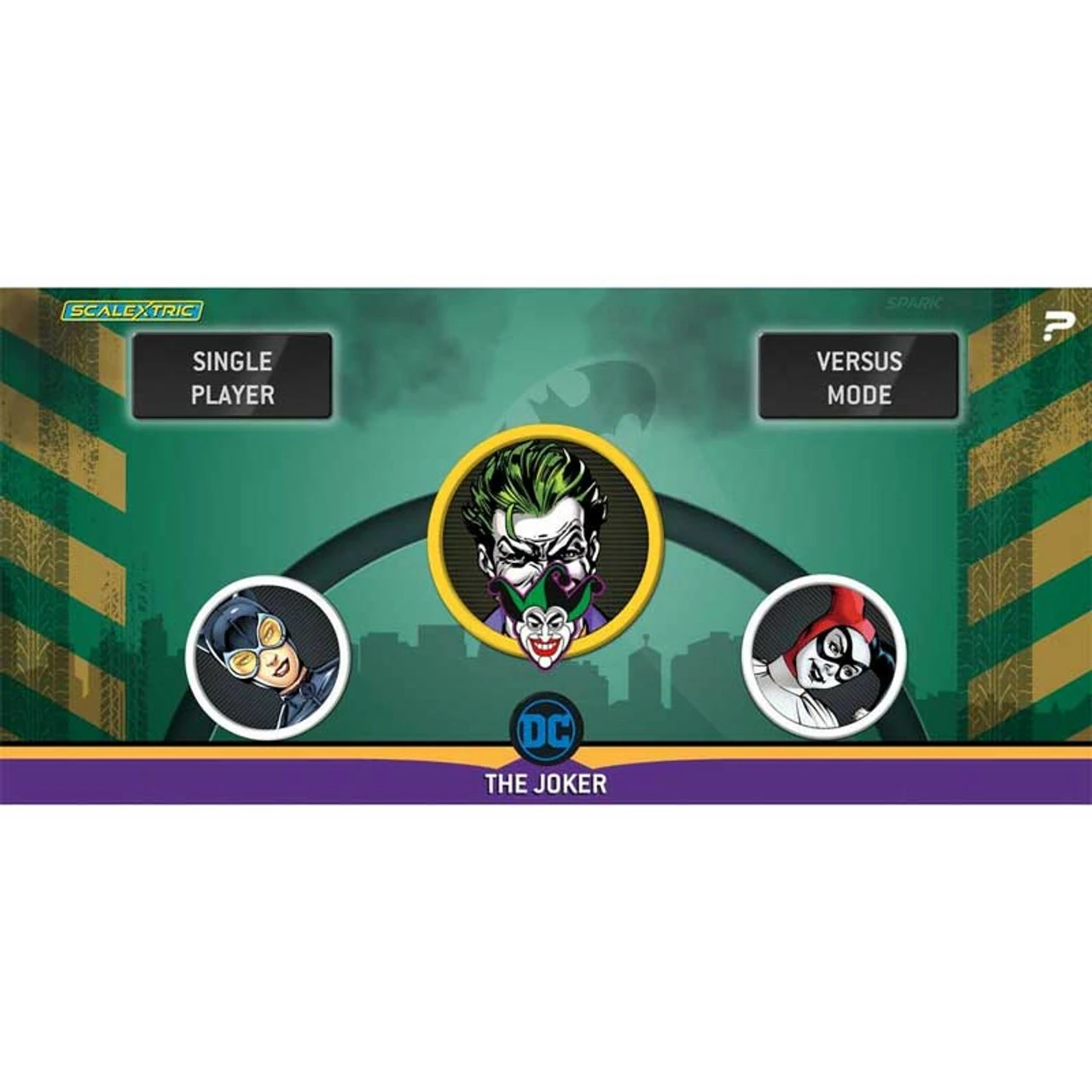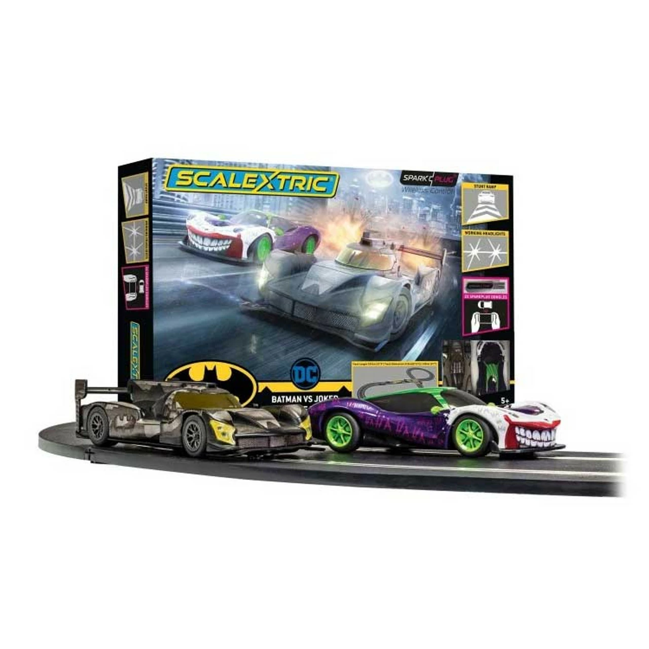This is the Scalextric Batman vs Joker Spark Plug 1/32 Slot Car Track Set. This set features the Scalextric Spark Plug technology, which allows you to race using smart devices rather than traditional hand controllers!