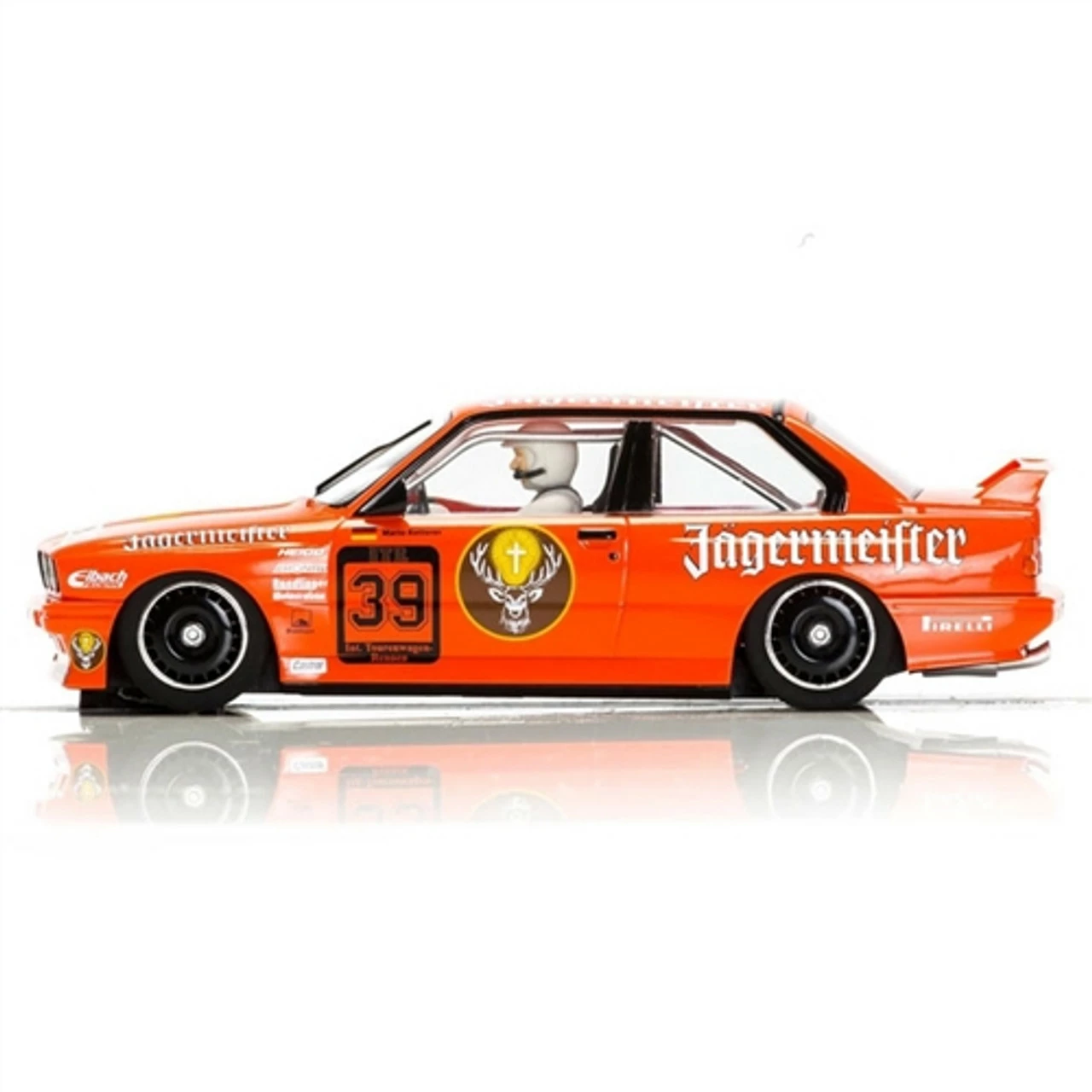 This is the Scalextric BMJ E30 M3 ‘Jagermeister’ 1988 Mario Ketter DTM 1/32 Analog Slot Car. The BMW E30 M3 raced across many nations and series, featuring an array of iconic color schemes. There werent many better than this fantastic orange livery, from the famous drinks manufacturer. Driven by Mario Ketterer for the 1988 DTM season, sadly the results did not match the success of the livery, however, the car did leave a lasting impression on anybody who saw it race.