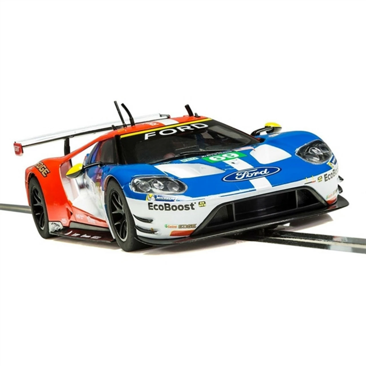 This is the Scalextric Ford GTE n.69 Le Mans 2017 1/32 Slot Car. The No. 69 Ford raced with Australians Ryan Briscoe, Scott Dixon and Brit Richard Westbrook at the wheel. The car finished 7th in class at Le Mans 2017.