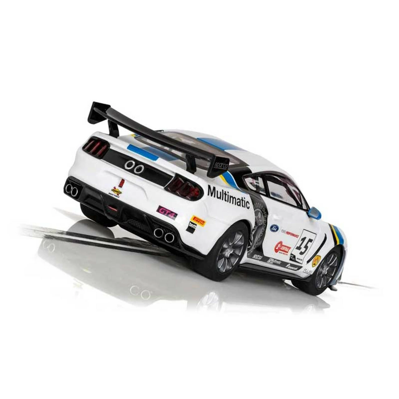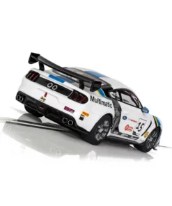 This is the Scalextric Ford Mustang GT4 British GT 2019 Multimatic Motorsports 1/32 Slot Car. The car features working lights and is Digital Plug Ready (DPR) for easy digital conversion.